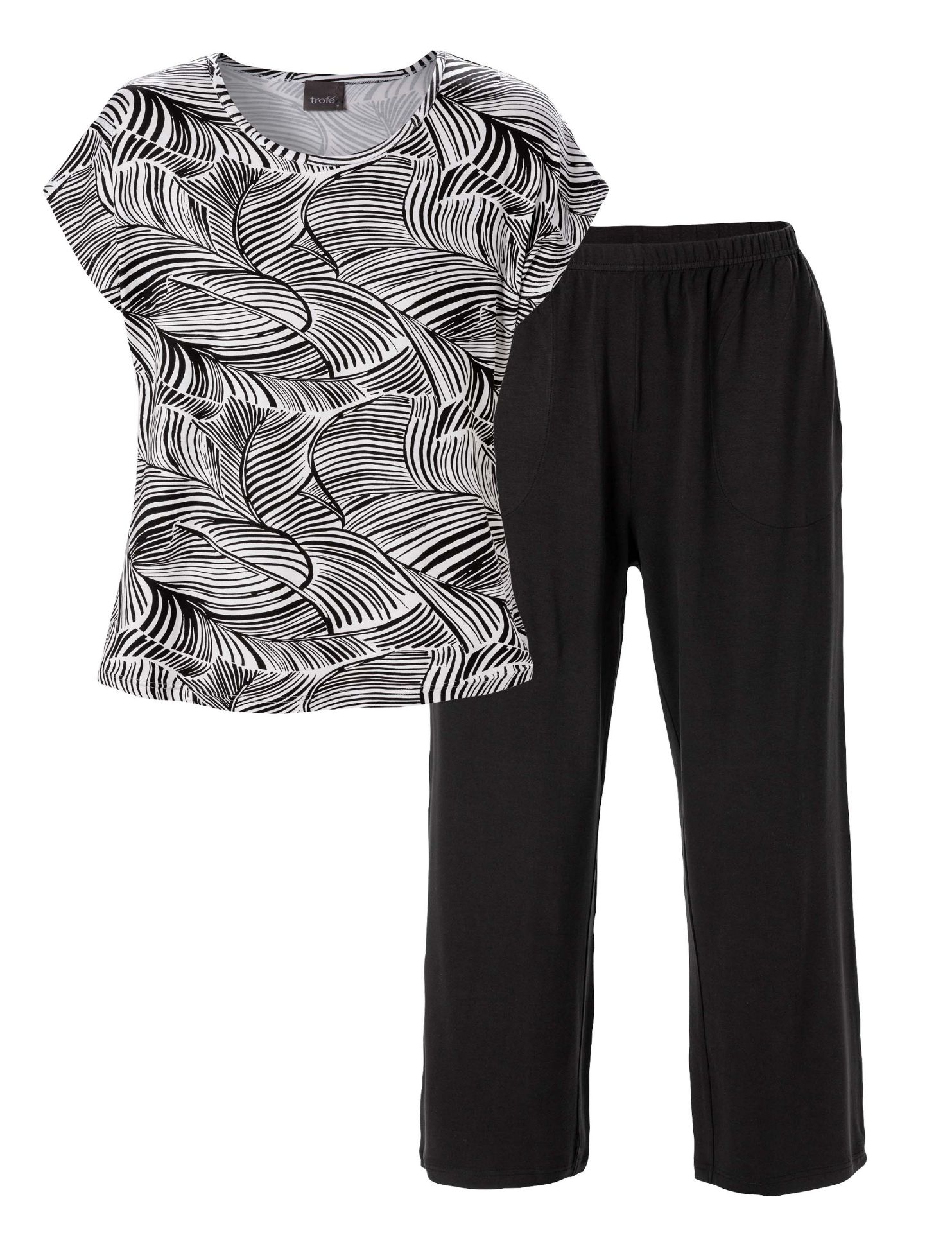 Pyjamas fra Trofè. Mønstret kortermet topp og ensfarget 3/4 lang bukse. 95% bambus og 55 elastan.