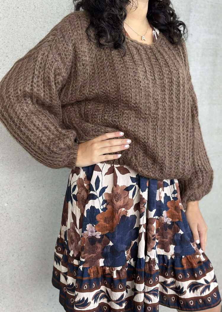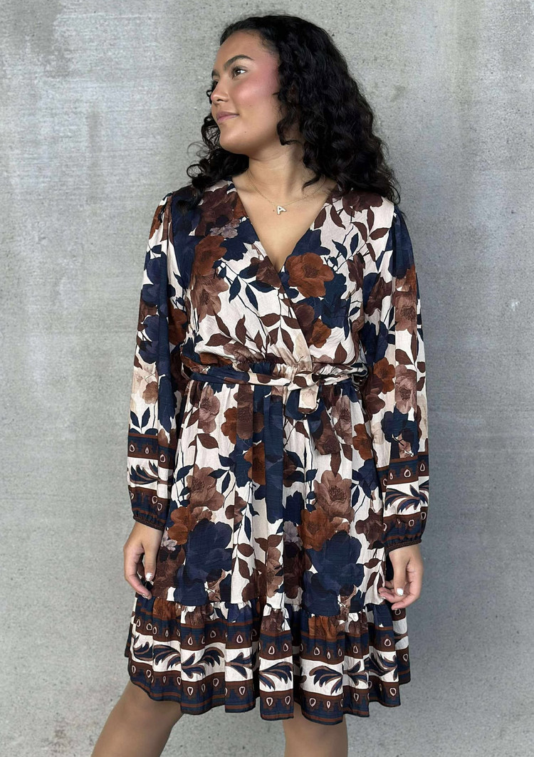 Kjole fra pepper. kjole med v-hals og lange ermer. en blanding av delikate farger som bergunder, camel, sort og beige. Kjolen har strikk og knyting i livet. Normal i størrelsen.