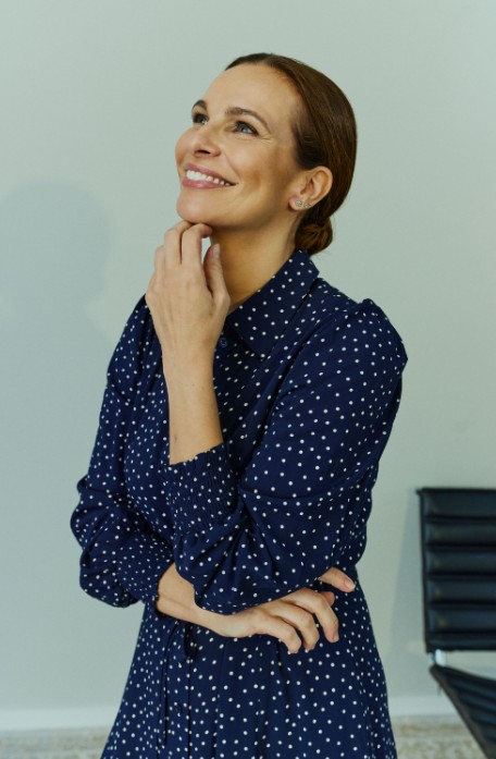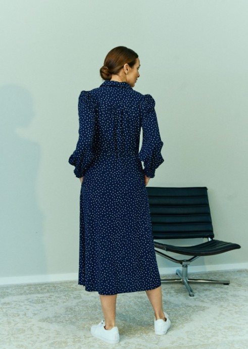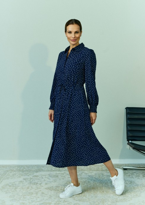 Kjole fra Claire. Elegant Skjortekjole i marineblå med delikat prikkemønster. Den klassiske kragen og knappelukkingen foran gir et tidløst utrykk, mens den feminine passformen skaper en flaterende silhuett. Kjolen har lange ermer og et lett, behagelig stoff som gjør den perfekt til både jobb og hverdagsbruk. Style med boots for en chic look eller emd sandaler for en lettere, sommerlig stil.