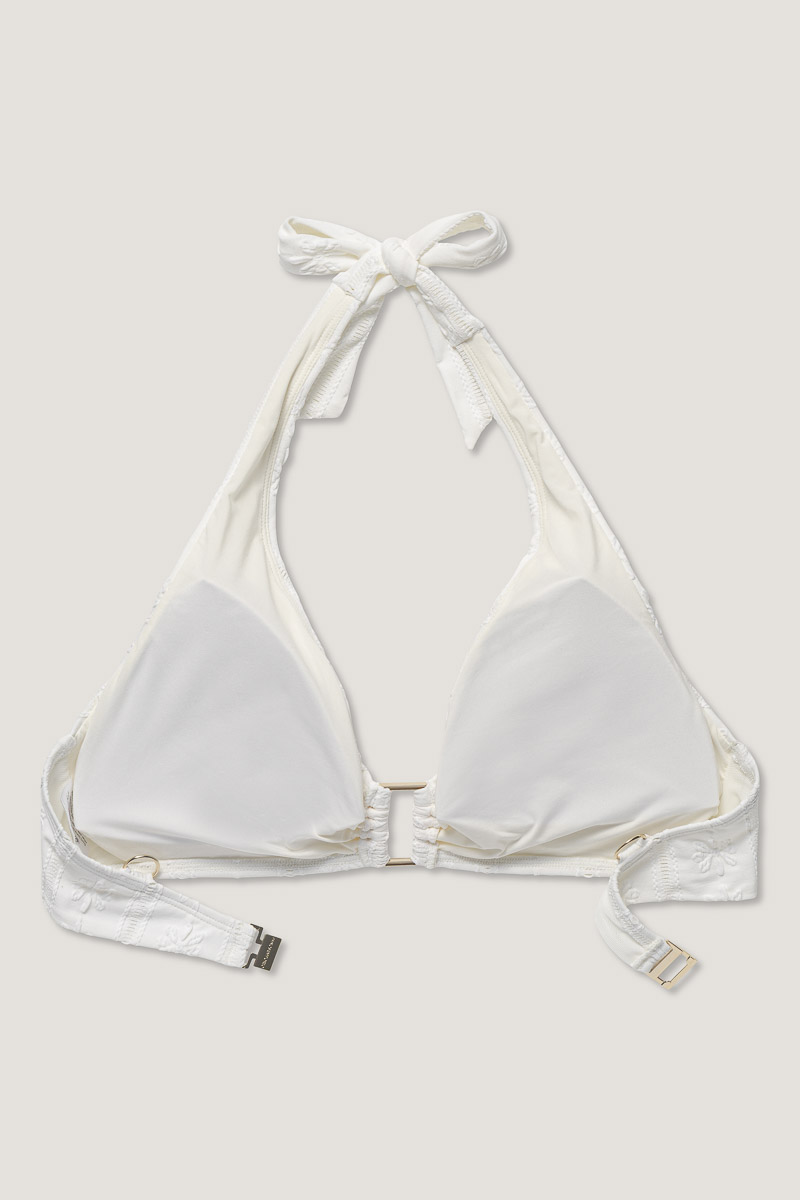 Enkel og elegant halterneck bikini topp. Formstøpt pute i cupen som kan fjernes og mesh i siden for ekstra hold. To-i-en stropper; knyt bak nakken eller via fester som "vanlige" skulderstropper. Passer A - C cup. Resirkulert materiale.