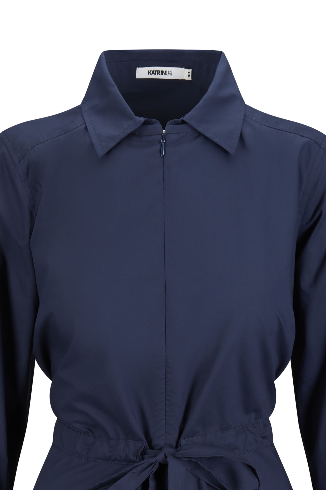 Langermet kjole fra Katrin Uri. Nydelig kjole i marineblå i bomullspoplin. Har knyting og lummer i midjen.