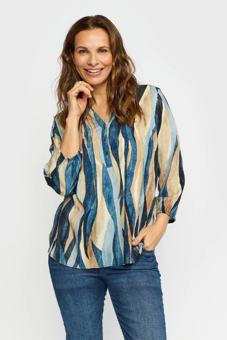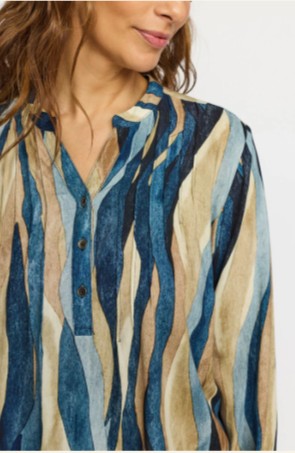 Bluse fra 2-Biz i blå og beige nyanser. Rund hals med knepping forran. Blusen er avrundet nede og har strikk i ermene.