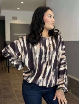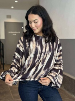 Mønstret bluse fra Pepper Sort og beige. Rund hals Strikk i liv og rundt ermer. 90% viskose og 10 % nylon. Passer til både skjørt og bukse