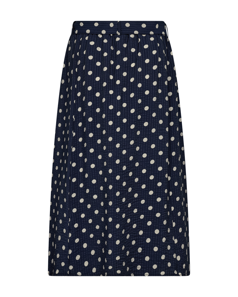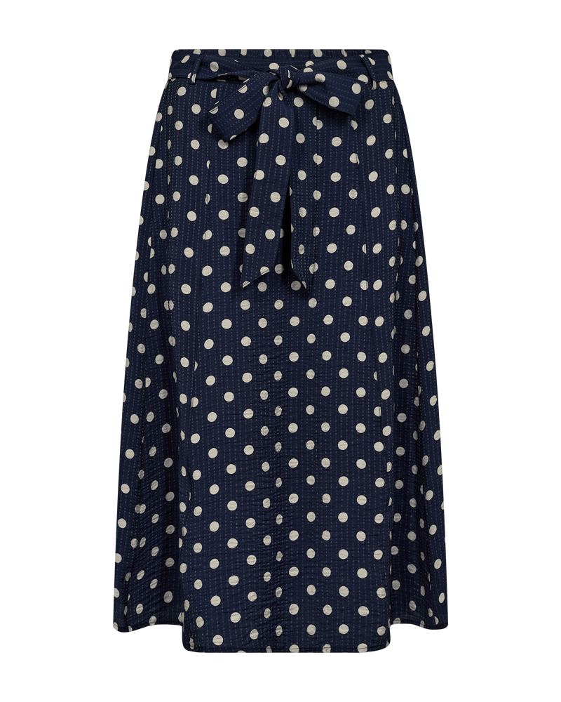 Skjørt fra FreeQuent. Skjørt i lett stoff marineblått i hovedfarge med offwhite prikker. Strikk i ryggen, beltehemper og knytebelte, skjørtet har sidelommer. Ca 75 cm lengde. Passer å style både med en strikket genser eller en penere bluse til et litt mer formelt bruk. Normal i størrelsen.