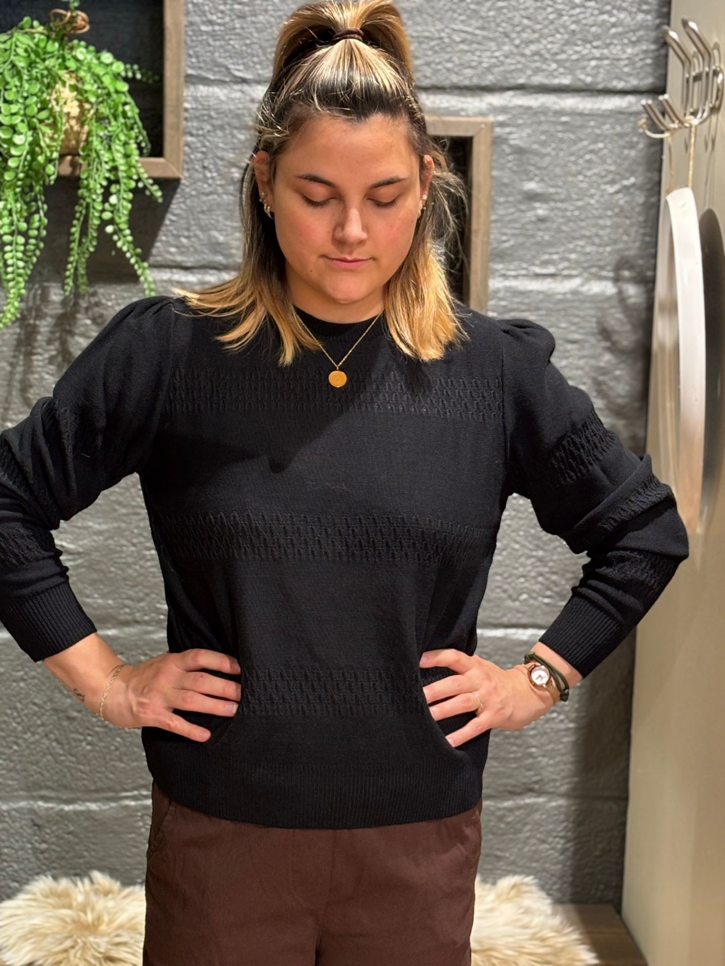 Genser fra Skovhuus. Klassisk sort genser med rund hals og full-lengde i armene. Genseren har flotte strikkede detaljer gjennomgående i genseren. Normal i størrelsen. Inneholder 50% bomull og 50% akryl. En slitesterk genser som kan styles til en rekke nøytrale og fargerike underdeler. En must-have i garderoben!