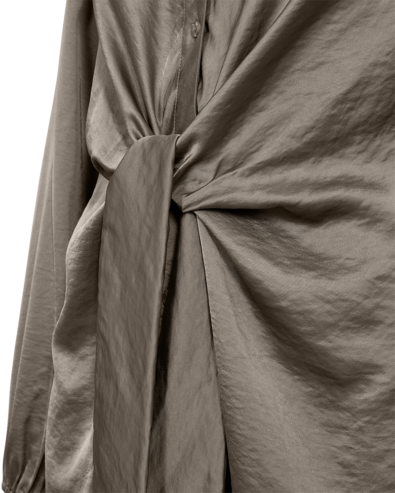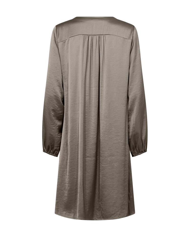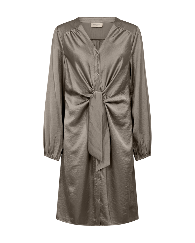 Sateng kjole fra FreeQuent. Kjole med v-utrigning og knyting i front som gir et flaterende uttrykk over magen. knapping i front, strikk på armen. Normal i størrelsen.