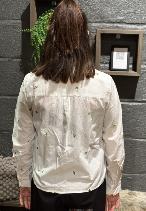 Søt skjorte fra Pieces, i bomull med broderte blomster. Rett litt vid modell