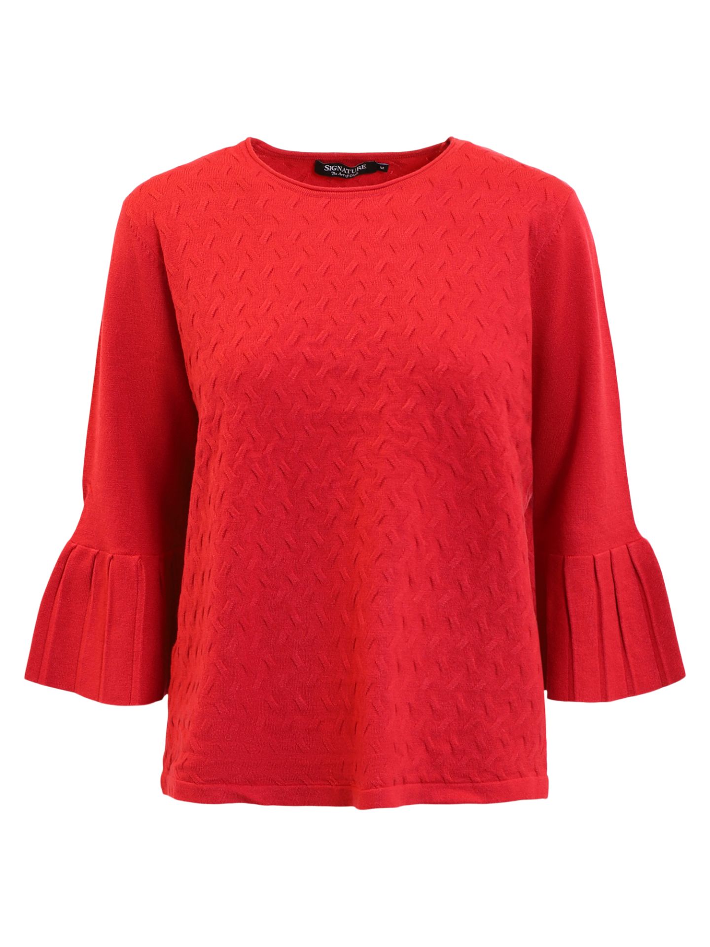 Genser fra Signature. Genseren har rund hals, tynn og behagelig i strikken, 3/4 erm lengde med en plissekant på nederste del. Rett modell. Pen både til bukser og skjørt. Litt stor i størrelsen, anbefaler 1 strørrelse mindre. 50% viskose 28% polyestser 22% polyamide