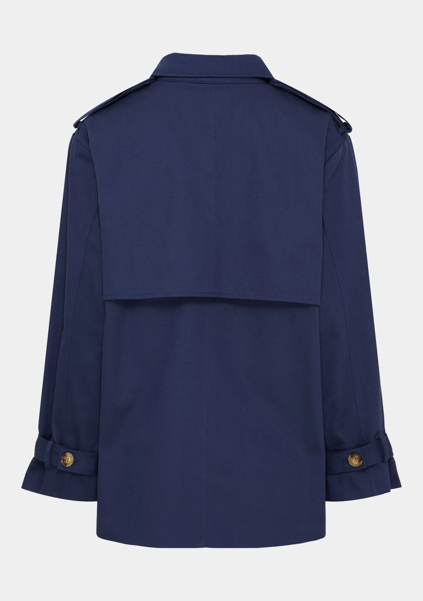 Kort trenchcoat fra iSay i en nydeli marineblå farge. Jakken har en skjortekrage og dobbeltradet knappelukking. 100% Bomull med for.