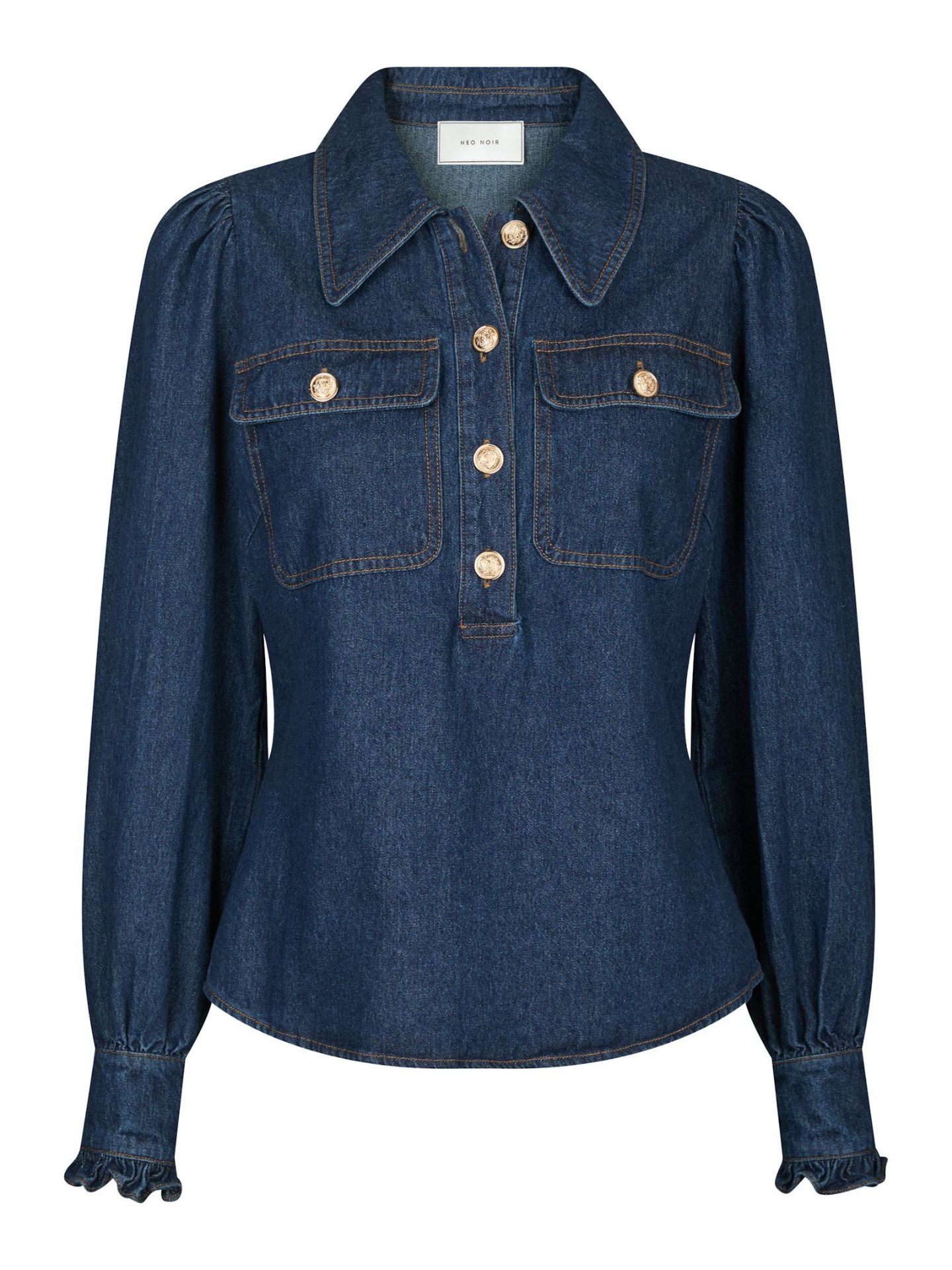 Jeans bluse fra Neo Noir. En feminin bluse med puff erm, gullknepping i front ned til midjen, brystlommer, innsvinget i midjen og buet på hoftene. Passer fint å style både til hverdag og en litt mer pen casuel anledning. Normal til litt små istørrelsen, vipper man anbefales å gå opp 1 nr.