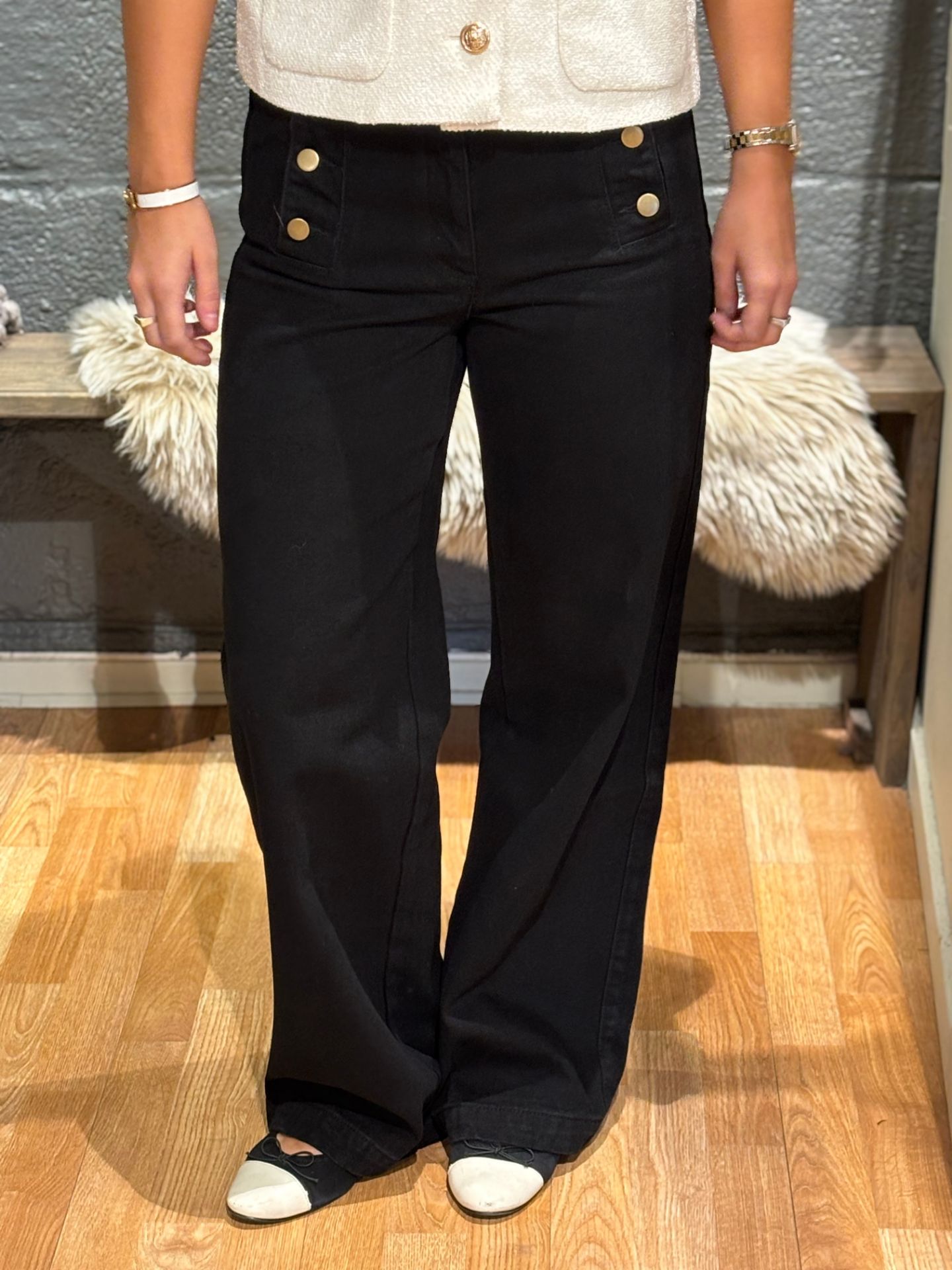 Bukser fra Katrin Uri. Råtøffe jeans med vide bein. Buksen har stilige knapper i lommen fremme, og gullknapp i linningen. Bukselommene har et stilig print. Normal i størrelsen. Inneholder 100% bomull. En bukse som kan brukes til både hverdag og fest. En av sesongens must-haves!