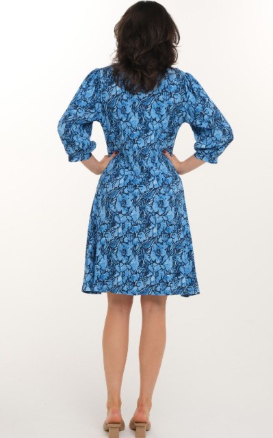 Blå bkomstrete kjole fra Zavanna Vid 3/4 arm med strikk nederst, rund hals. Sømmer sydd inn på fremsiden for en smalere siluett. Stoffet gir en plissè følelse. Knelengde. Trompetfasong. 94% resirkulert polyester, 6% elastane. En kjempefin kjole til finere anledninger.