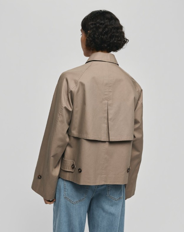 Kort jakke fra MSCH Copenhagen. Boxy modell med kappe og i tillegg med legg bak. Kan strammes inn nede. 100% bomull. For i polyester.