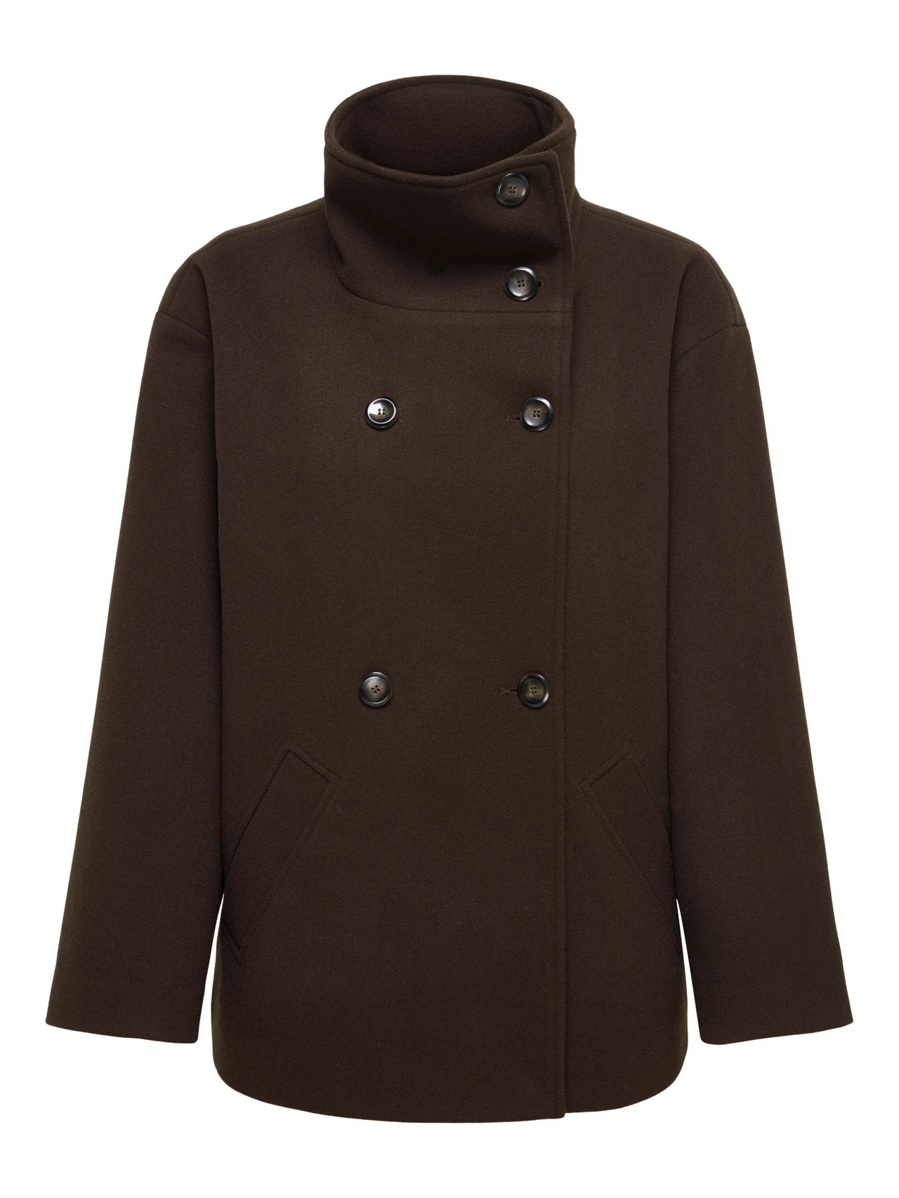 Jakke fra Only. Lett stoff jakke fra Only med høy hals, skrålommer og lengde til midt på hoftene. Jakken er god i størrelsen, er man midt mellom 2 størrelser anbefaler vi å gå ned.