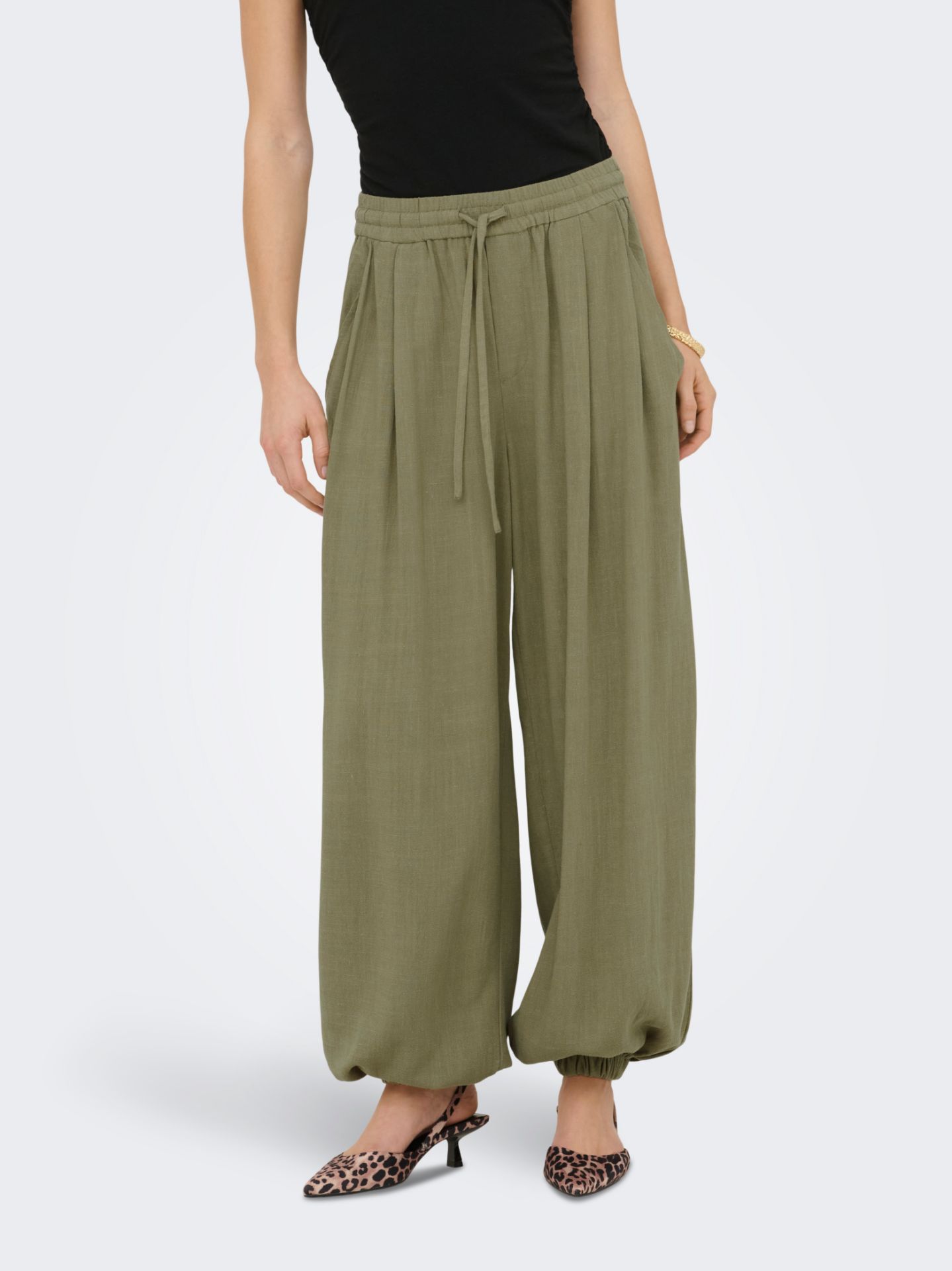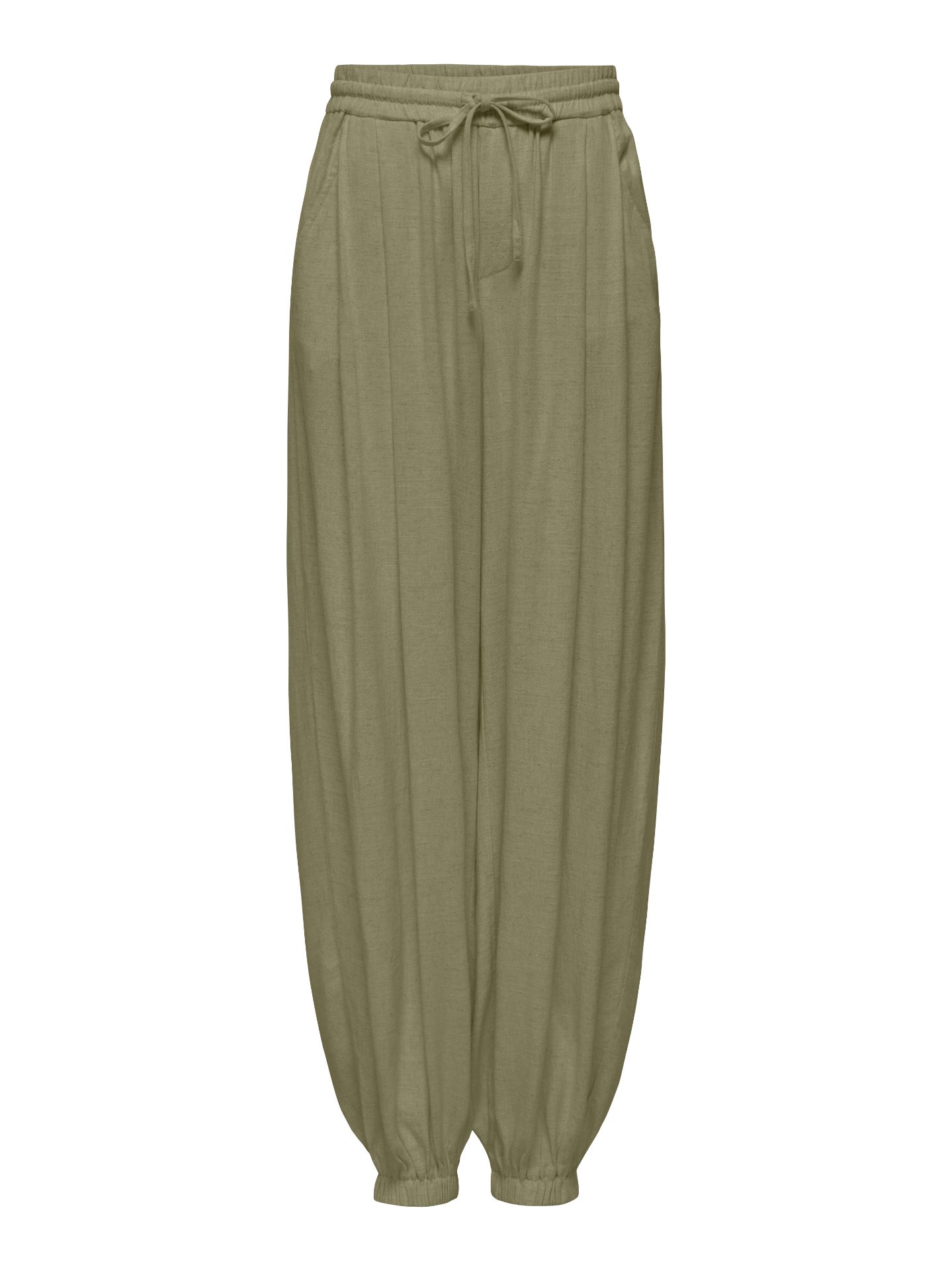 Linbukse fra Only. En trendy barrel bukse modell i mykt og behagelig viskose og lin blanding. Strikk i midjen og rundt ankel, buksen ahr lommer. Finnes vest og bluse i samme kvalitet. litt stor i størrelsen, vipper man kan man gå ned 1 størrelse. Perfekt bukse til lengre reiser.