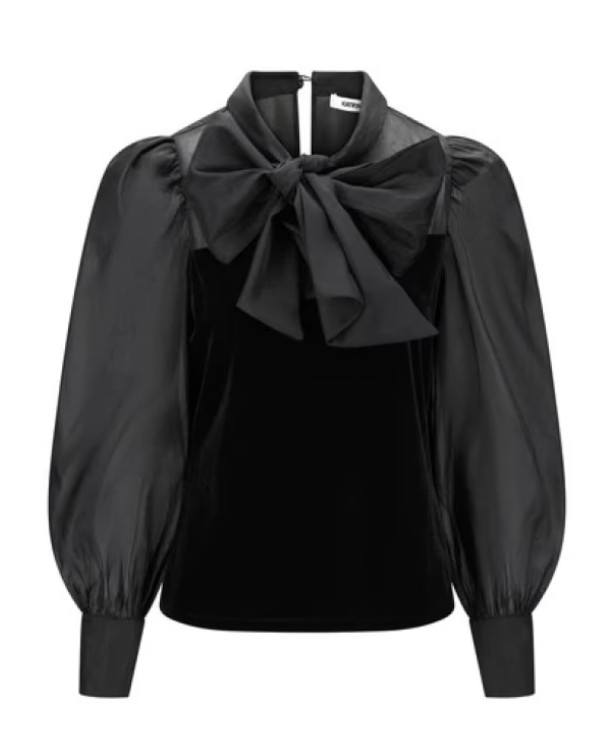 Topp fra KatrinUri. En lekker topp med 2 kontrast stoffer. Chiffong på skulder og ermer, med fløyel fra barm og ned. Toppen har høy hals med bånd for knyting, feminine puffermer, og manskjett. Normal i størrelsen.