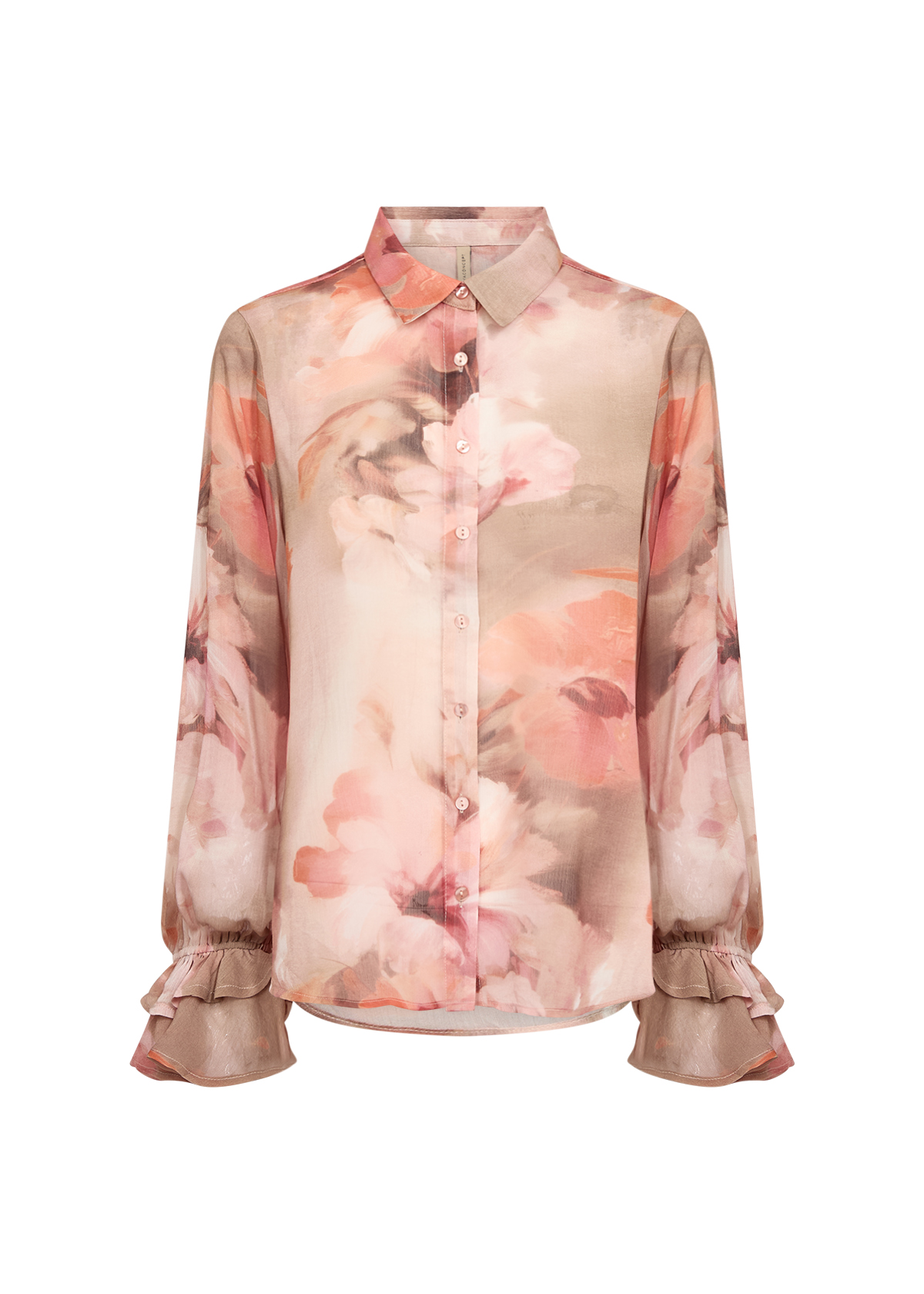 Nydelig romantisk bluse fra Soya Consept. Blomsterprint i duse farger. Knepping foran, avrundet kant nede og rysjer på ermene. 100% resirkulert polyester.