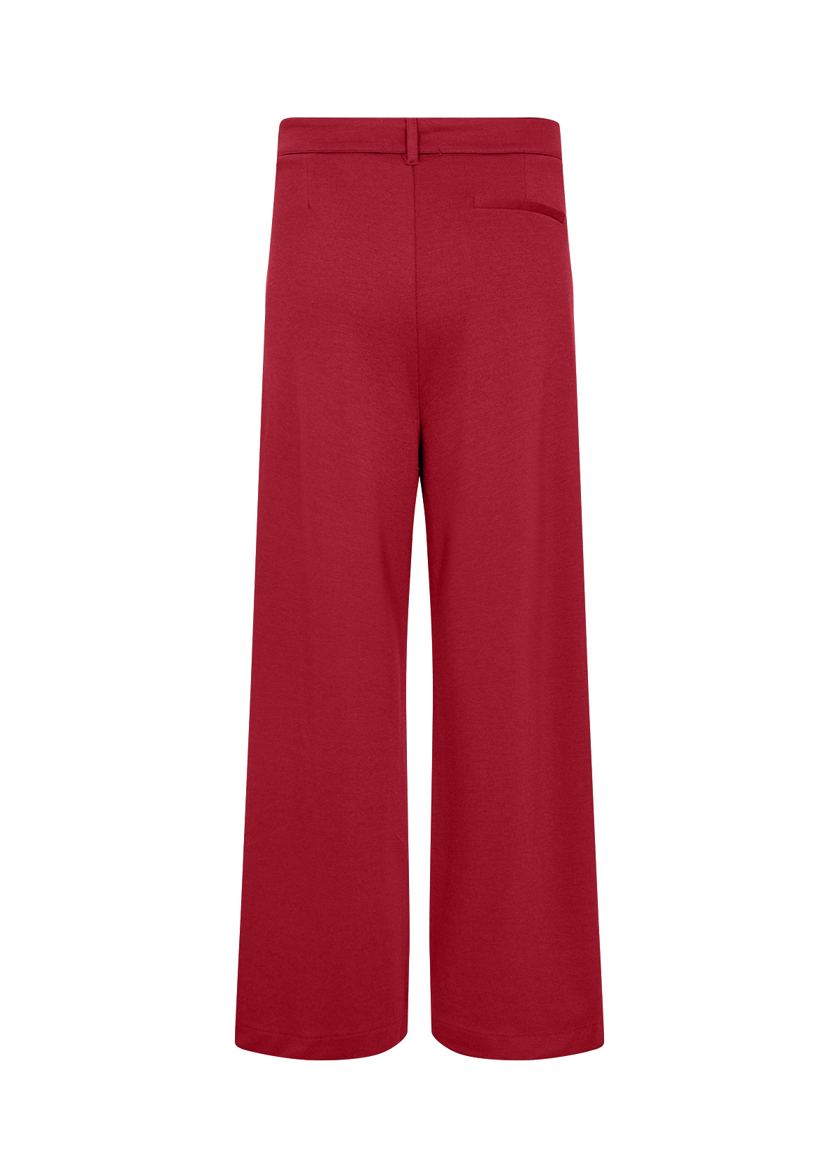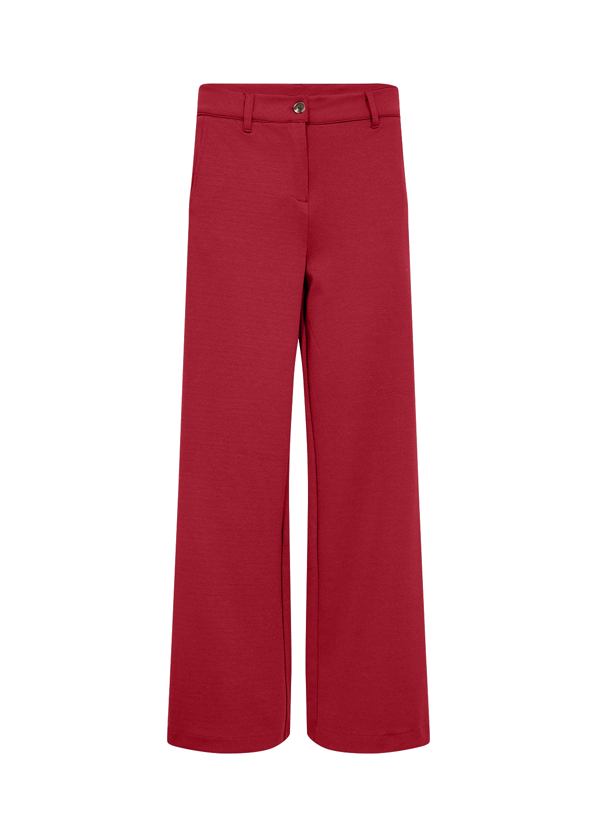 Rød dressbukse fra Soyaconcept En råtøff dressbukse i rødt i et herlig stretchy stoff. Rette ben. Buksa har en fuskelomme bak, to skrålommer fremme. Beltehemper og rød knapp i midjen og rød glidelås. Normal i størrelsen. 73%polyester, 24%viscose, 3%elastan. Buksen kan brukes til alle anledninger, til en basic topp eller en mer pyntet.