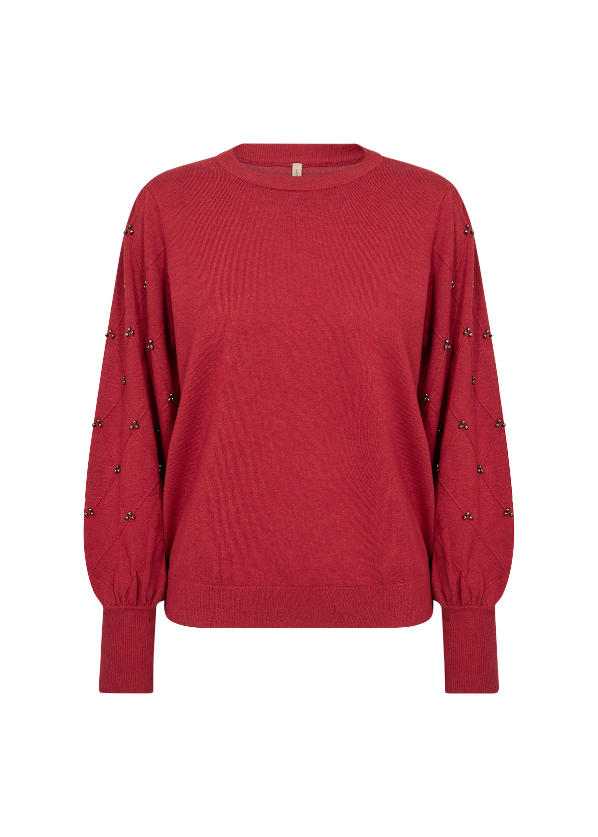 Genser fra Soya Concept. Rød genser med perler på ermen, feminin puff på skuldrene og lange mansjetter. Rund hals. Normal i størrelsen. Perfekt og kombinere til både hverdag og fest.