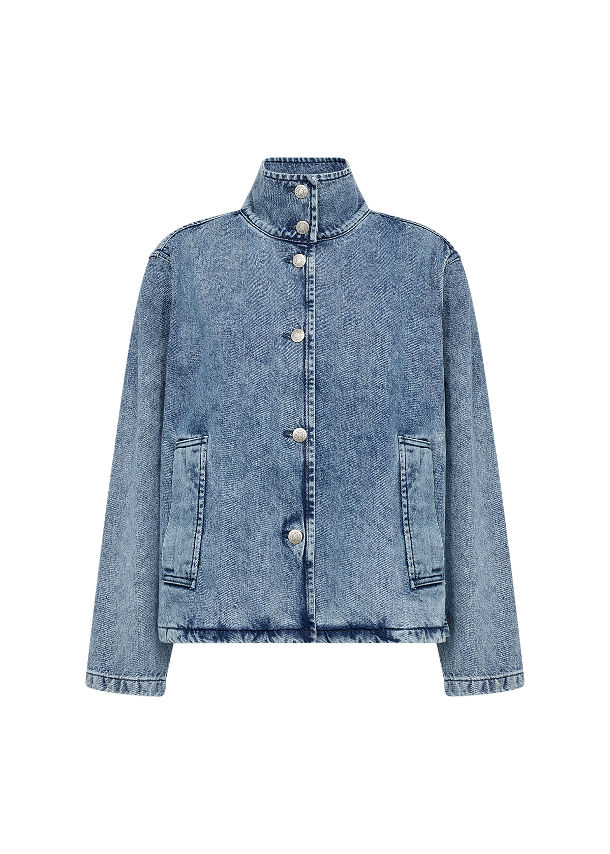 Jeansjakke i A fasong med skrålommer fra Soya Consept. Knepping foran, høy rund hals. Litt romslig i str.