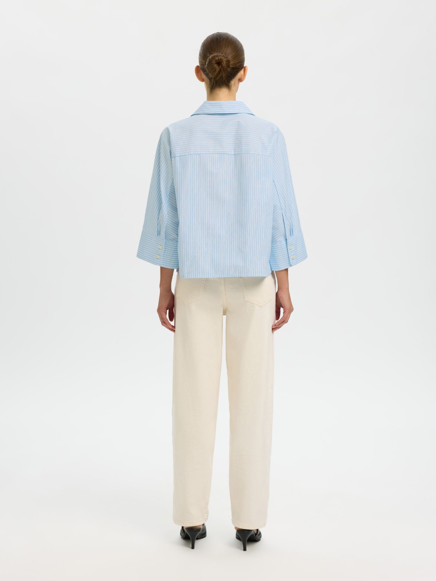 Striepete skjorte fra selected femme. Kort vid skjorte med 3/4 ermer. Kul modell med brede masjetter.
