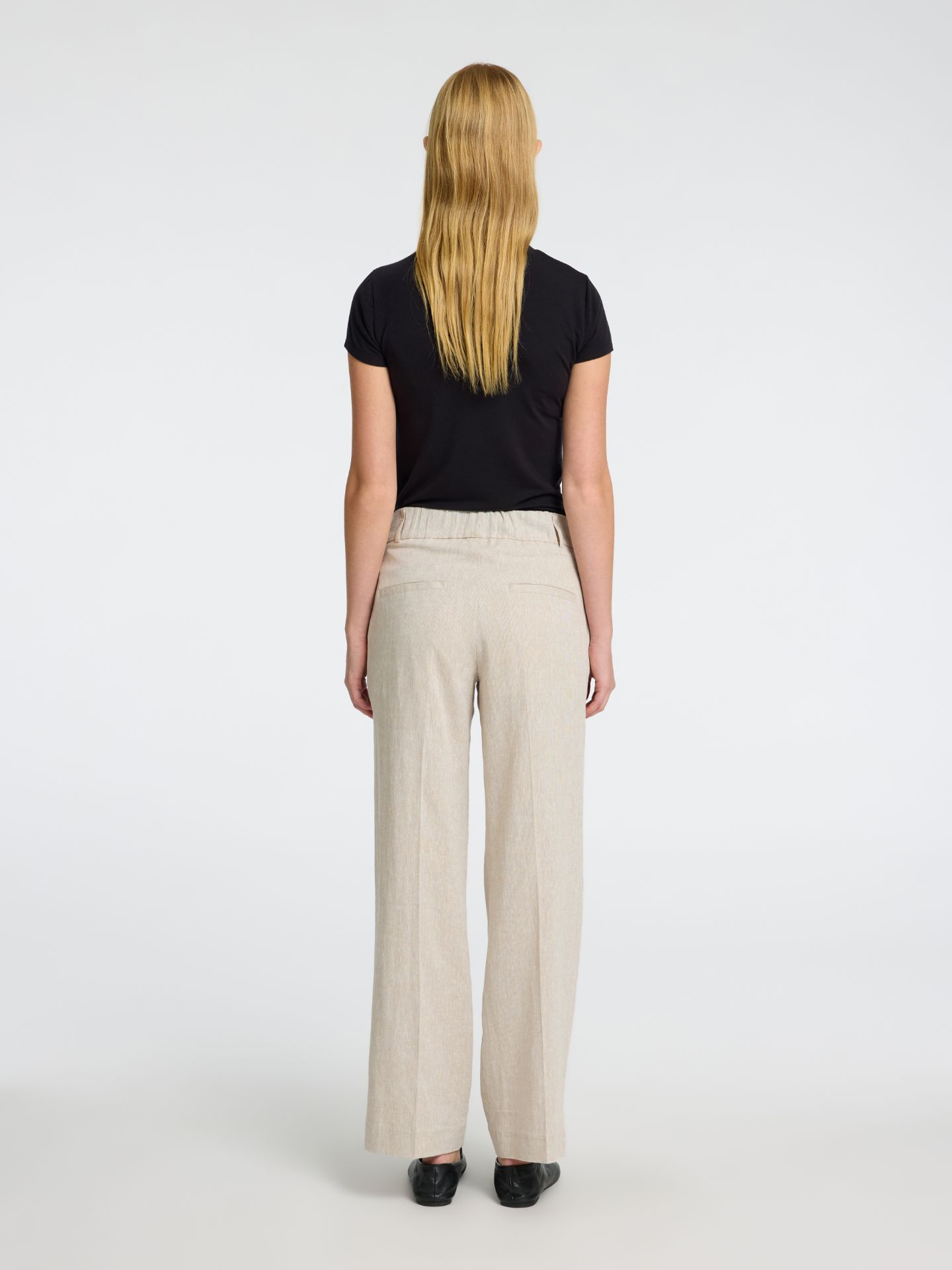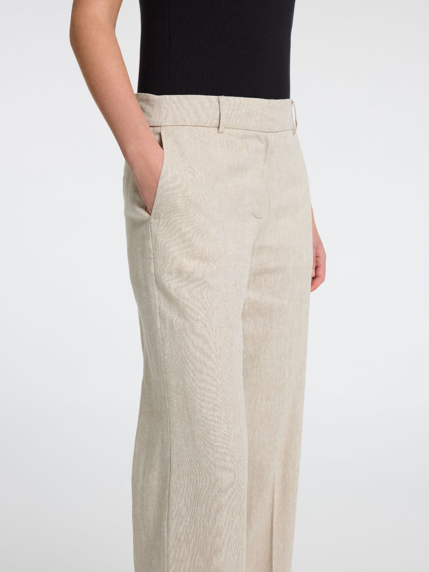 klassisk bukse med rette ben i flott blanding av lin og viscose. Sidelommer og baklommer. Beltestropper. Strikk bak. 55% lin 45% viscose.