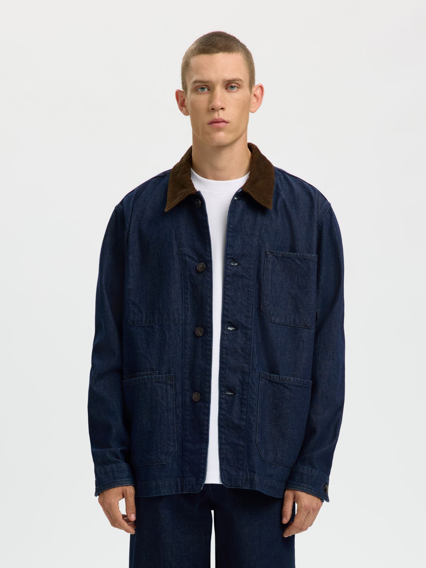 Jakke fra Selected Homme. Jeansstoff med krave i cord, lommer og knepping foran.