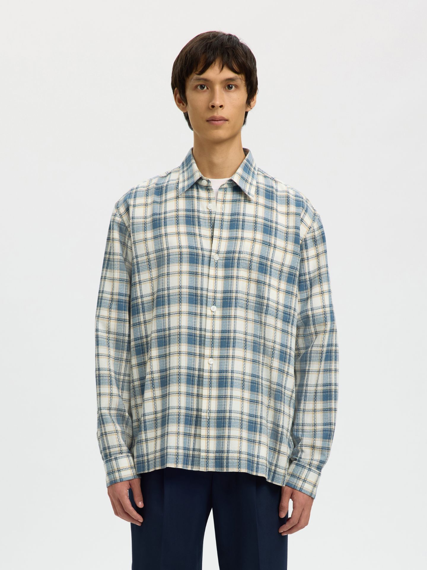 Skjorte fra Selected Homme. Nydeli skjorte i en fargeblanding av hvit, beige, blå og sennepsgul. Har en relaxed fit. 100% Bomull.