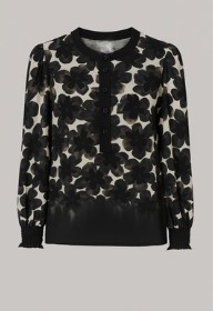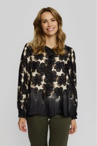 Mønstret bluse med print. Knappestolpe foran. Kinakrage og strikk rundt ermene. 70% viskose og 30% silke. Vid i fasongen.