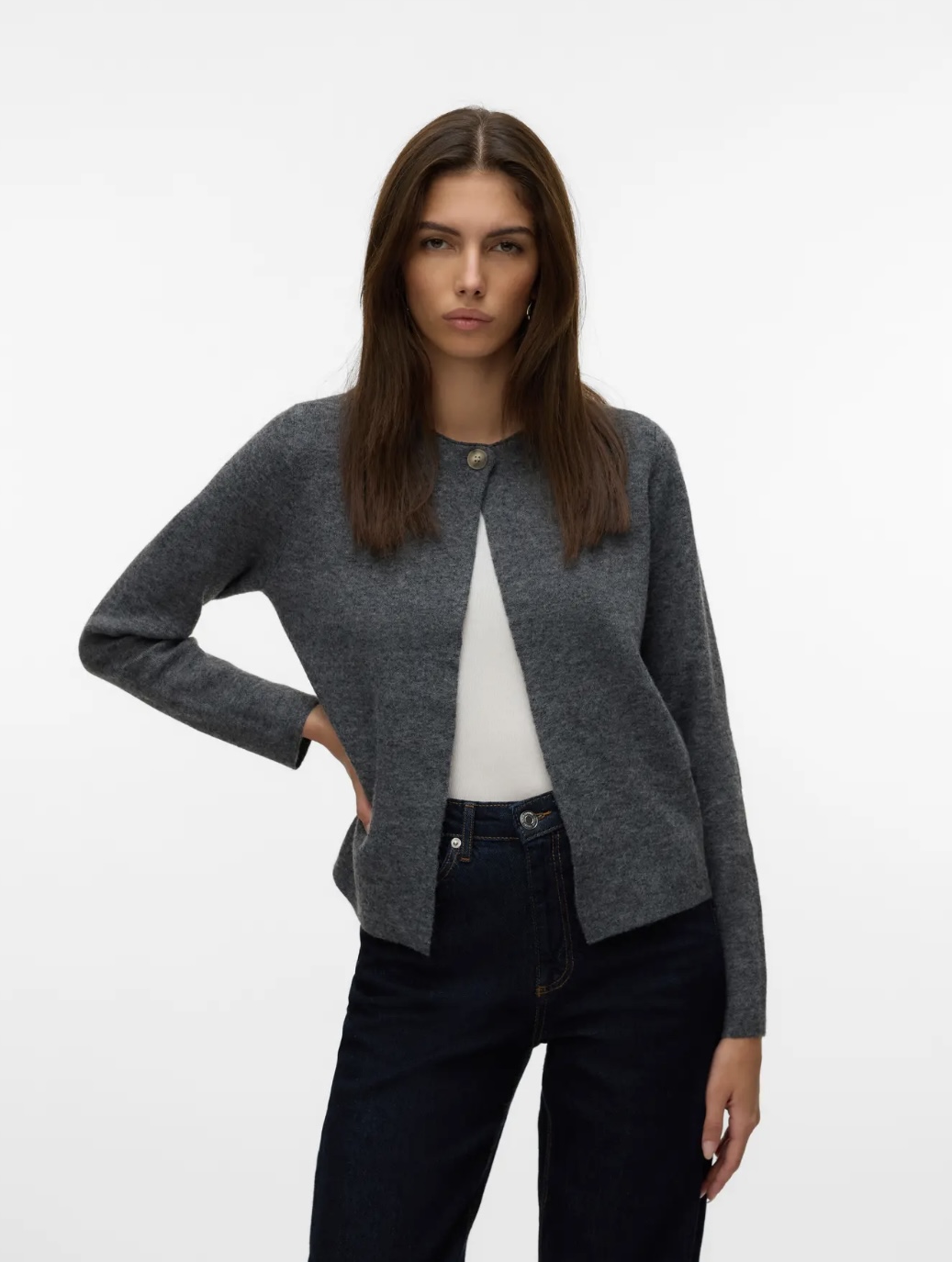 Strikket cardigan fra Vero Moda i mykt stoff, rund hals og 1 knapp oppe i hals. Litt små i størrelsen så gå gjerne opp 1 str.