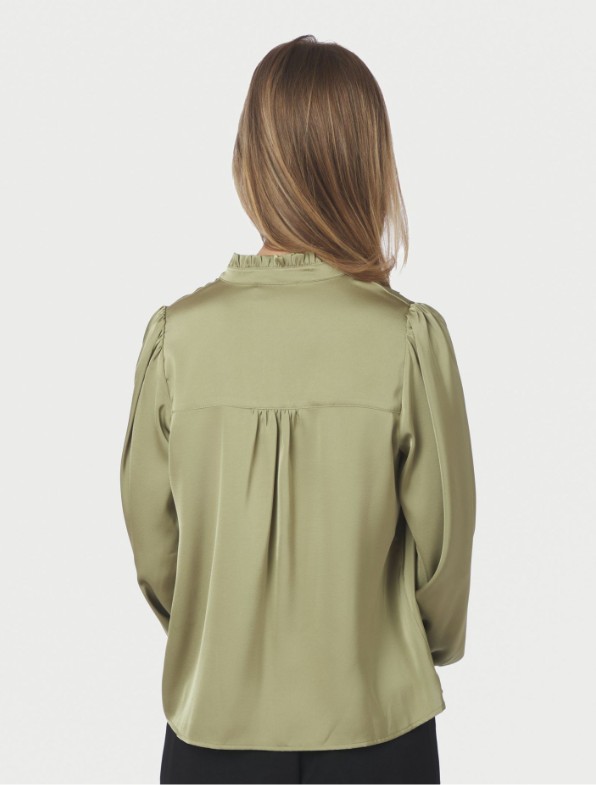 Nydelig bluse i lindegrønn fra Neo Noir. Knepping i front med rysjer. Strikk rundt ermene. Rynker på skuldrene. Passer til både fest og hverdag. Normal i str.